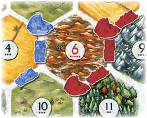 Since the settlements and keeps usually border on 2-3 terrain types, they can "harvest" up to 3 different resources based on the dice roll. Here, the yellow settlement [C] borders on forest, mountains, and pasture.