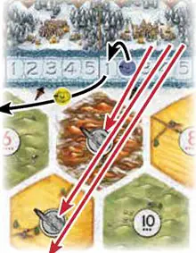 If there are multiple wildlings in that clan area, the wildling in the camp closest to the numbered trails advances. The other wildlings in that clan area each move 1 camp closer to the clearings to fill unoccupied camps.