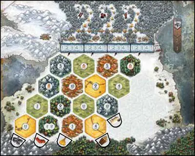 Note: It can be a lot of fun (and challenging) to play with a variable game board (with the terrain hexes arranged randomly). You can change the board each game. This allows you to explore new strategies.