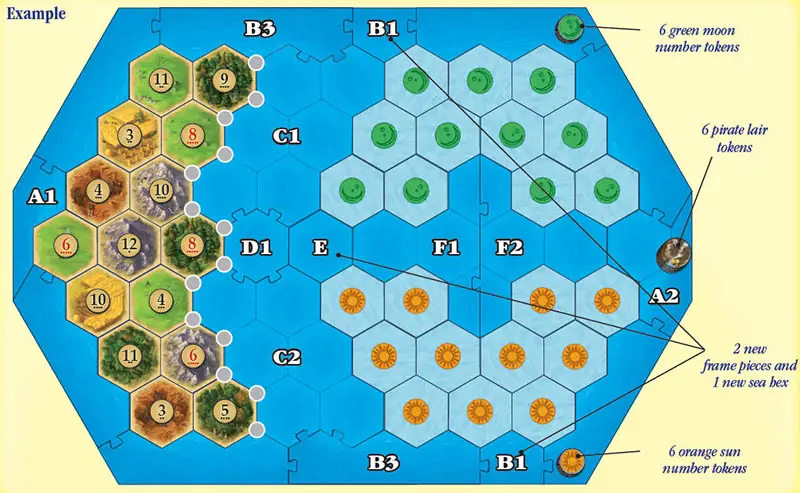 Use sea hex E to fill the gap between sea hex D1 and sea hex piece F1. Otherwise, build the board exactly as shown in the example below.