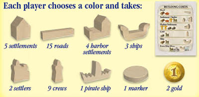 The last player to place a settlement is the first to place a road adjacent to that settlement. That same player then places a settler ship (ship + settler) on one of the sea routes adjacent to his or her harbor settlement. The other players follow clockwise. Once everyone has placed their pieces, the starting player begins the game by rolling the dice.