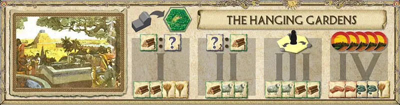 A Wonder may be started at any time during your turn, as long as you meet the Prerequisite and pay the first stage building costs. Take the Wonder Card into your possession and place the Wonder Coin gray-side-up on the matching hex.
