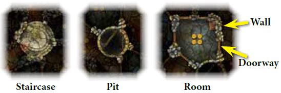 During the game, characters move around the dungeon, which consists of three types of spaces: staircases, pits, and rooms. Rooms are separated by walls and doorways.