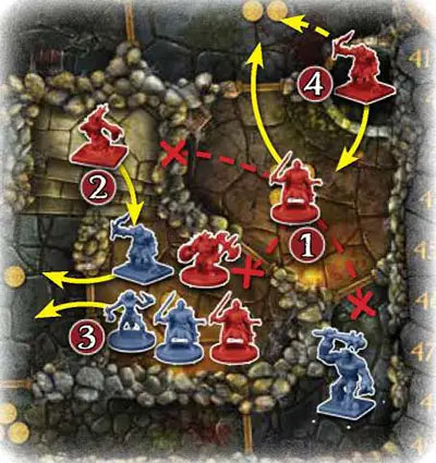 Action 1: The wall prevents him from moving this Adventurer to the staircase on its left. He cannot move it to the lower-left room because it already contains five characters, and the blue Cave Troll prevents him from moving it to the lower-right room. He chooses to move it to the room above.