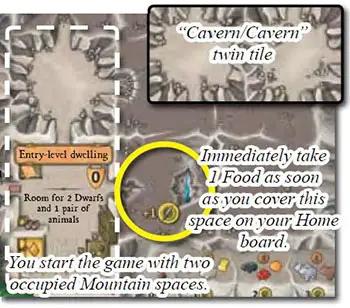 Additionally, you may place a "Cavern/Tunnel" twin tile on two adjacent empty Mountain spaces of your Home board. The new tile must connect with your cave system, i.e. you must place it (horizontally or vertically) adjacent to an already occupied Mountain space.