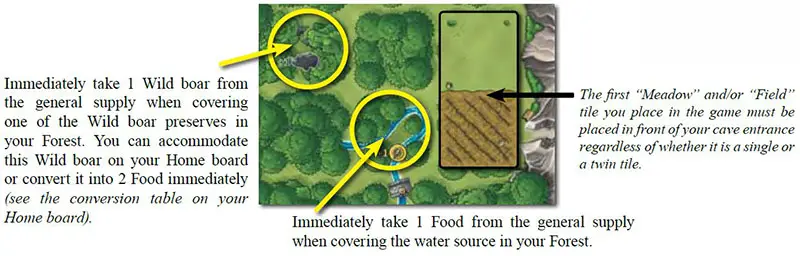 If you have no Fields, Meadows or Pastures in your Forest, place the single tile in front of your cave entrance. See page 20 for more details on Meadows and Pastures.