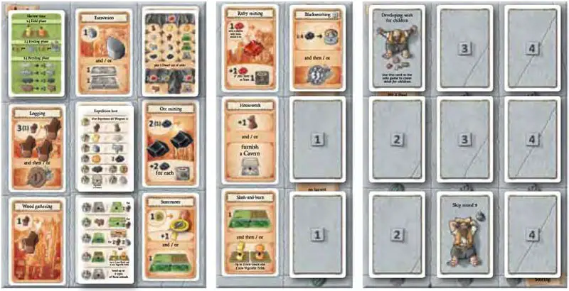 In the Work phase, place one Dwarf after another. There are no opponents that you have to wait for. The goal of the solo game is to get the highest score you can. Try to beat the "magical score" of 100 points. You start the game with 2 Food.