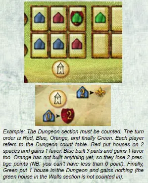 According to the section (the Dungeon, the Walls or the Towers) you are counting, each player, following the turn order, counts the number of castle parts they have built (that is, the number of houses they have placed in the given section) and refers to the corresponding count table.