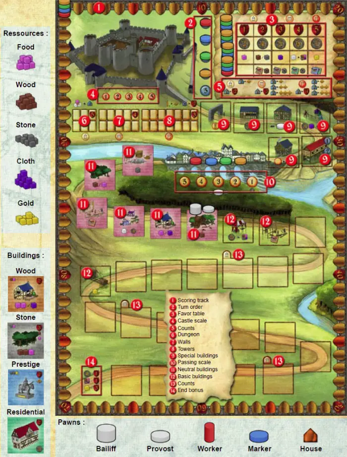 The castle is composed of 3 sections: a dungeon, walls, and towers. The bailiff's movement along the road determines the advance of work in the castle, and the shift from one section to the other. By advancing quickly (and well!) in the building of the castle, the masters accumulate prestige. If you are shrewd, you will also be able to gain the King's favor!