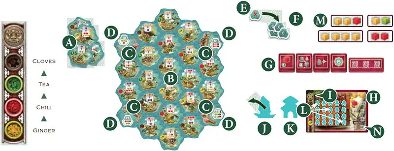 Mthe middle of the table. In reverse turn order, each player will select their starting cubes, put them in their cargo holdNand place their boatJon any market tile. Once all players have selected their starting cubes, return any remaining cubes to the supply.