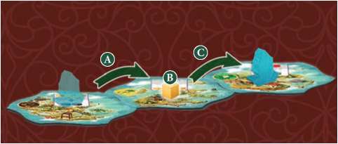 You may move your boat to an adjacent tile for free A . Then, you may continue moving by placing a single cube B (of your choice) from your cargo hold onto each tile you leave C . You may continue moving this way as long as you have cubes available in your cargo hold.