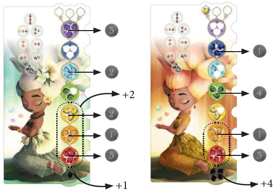 Each player counts, on their board, the number of aligned harmonized Chakras, from the bottom to the top.