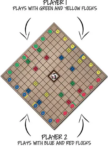 It's simple; all rules from standard 4-player Chickapig apply, but turn the board diagonally so that each player controls two adjacent flocks of Chickapigs. During your turn, you may move either of your two colors in any order, but Chickapigs still have to go through their own color-coded goal.