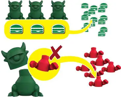 Example: Beth has 4 workers, 3 with no components and 1 with one component. During the Feeding Phase she must pay 4 food. But Beth only has 3 food, so she must lose the i component from her worker, returning it to the supply.