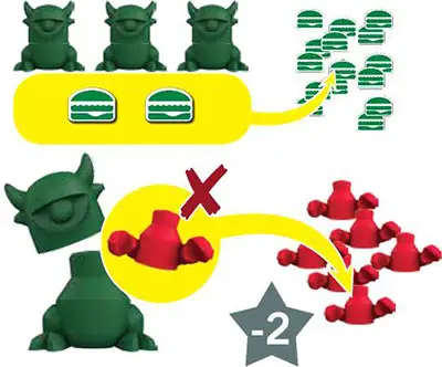 If you don't have enough food, then for each food you are short you must lose one of the components attached to one of your workers (return it to the general supply). If you have no components attached to your workers, then lose 2 points instead for each one you're short.