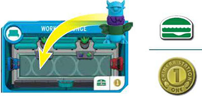 Unlike the modules, the Worker Lounge may contain any number of workers. Workers are sent to the Worker Lounge when displaced by a claw worker or can be placed there directly as well. When your worker enters the Worker Lounge for any reason, gain either 1 coin OR 1 food, your choice.