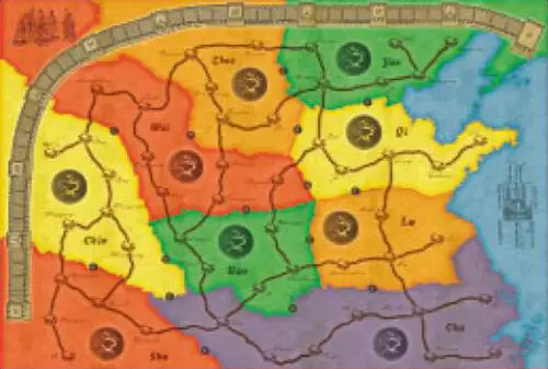 It depicts a map of China around 200 B.C. Of the 9 regions on the map, 8 consist of four pairs of regions sharing the same background colors (e.g. Zhao and Lu). Purple appears only once on the board, in the ninth region (Chu).