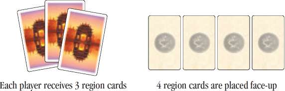 The remaining region cards are shuffled. Each player is dealt a hand of 3 face-down cards. The remaining cards are placed as a face-down draw pile near the board. The top 4 cards in the draw pile are revealed and placed face-up next to the draw pile.