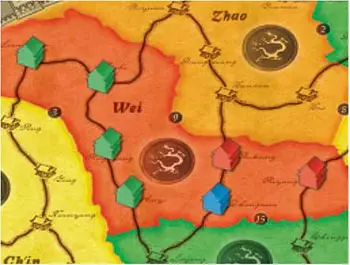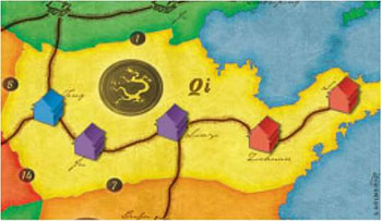 Example 6: The Emperor marker is placed onto the number 3 and the alliance between Wei and Ch'in is scored. There are 2 emissaries in Wei -1 blue and 1 red. There are 4 emissaries in Ch'in - 2 blue, 1 red and 1 green. Doris (blue) has a majority in both Wei and Ch'in and receives 6 points (4+2). The other players receive nothing.