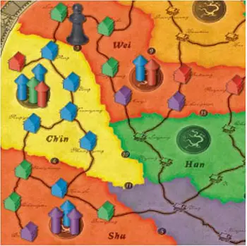 Chris has 3 yellow cards in his hand. There are already some playing pieces in both of the yellow regions, Qi and Ch'in. Since Chris cannot place more than 2 pieces on any turn, he can choose to use 2 yellow cards either to place 2 pieces into either Qi or Ch'in or as a 'joker' to place 1 piece into a region of a different color.