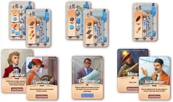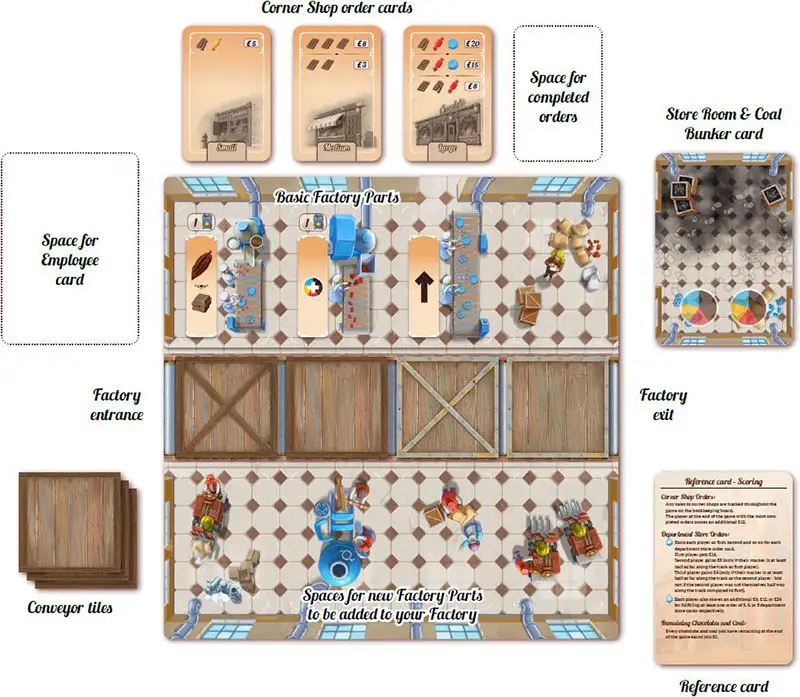 Make a common supply beside the play area containing all the chocolate and coal, and one spare Conveyor tile. Put any unused Factory boards, Conveyor tiles, and Player markers back in the box.