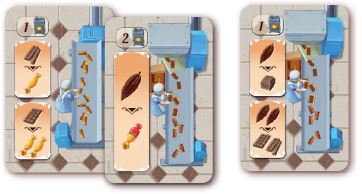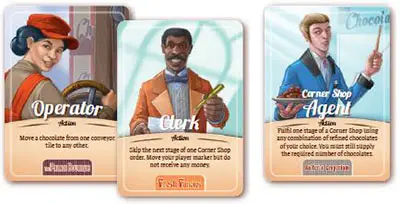 In turn order, use the chocolate in your store room to fulfill any combination of your current Corner Shop Order cards and the one Department Store Order card associated with your current Employe.