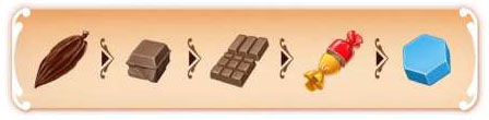 To fulfill a stage, take from your store room all of the chocolates shown in the stage, and return them to the supply. When you do this: