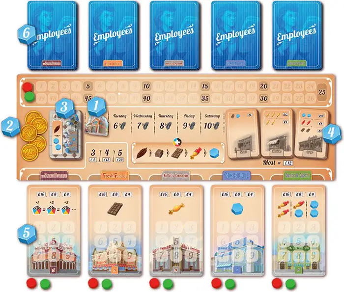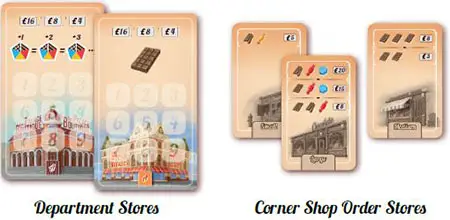 At the end of each day you can use the chocolate pieces in your store room to fulfill your own personal Corner Shop order cards, and one of the competitive Department Store Order cards.