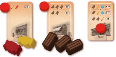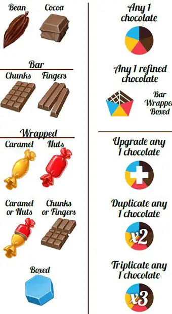 Supply refined chocolates of your choice, each of a different type (Chunks, Fingers, Caramel, Nuts, or Boxed), and move 1 space along the track for each chocolate supplied.