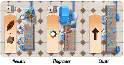 Place a conveyor tile at the entrance on the left-hand side of your Factory, and load it with 1 Bean, taken from the supply. This represents the raw material entering your Factory from which you will make your chocolates. It does not cost coal to load the conveyor.