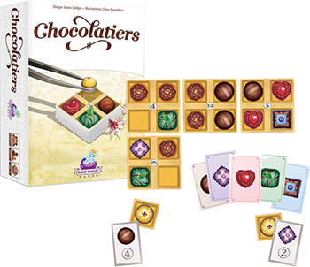 In Chocolatiers, you take on the role of a young chocolatier boxing up chocolates to make a decadent chocolate display! Draw chocolates from the Share Tray and turn them in to fill boxes.