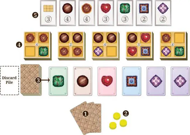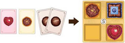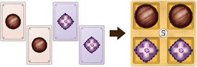 Example: Claire wants a Box tile that shows 2 Violet and 2 Truffle chocolates. She discards 2 Violet and 2 Truffle Chocolate cards from her hand and takes possession of the Box tile.
