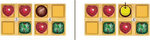 She takes 1 of her Wild Chocolate tokens and places it on her Display so that the Raspberry chocolates are connected.