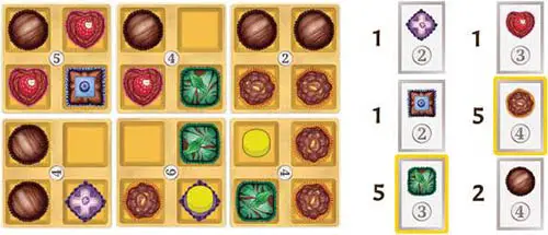 You may rotate Box tiles as needed. The chocolates on the adjacent Box tiles need not match, but may help you win the Scoring cards at the end of the game.