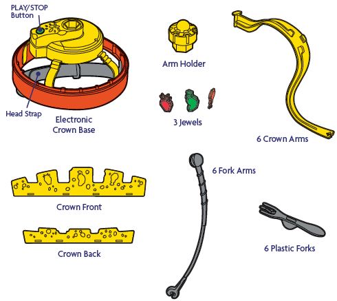 The first time you play, insert batteries into the crown base (see illustration on back page). Note to parents: Wash Forks thoroughly before use.