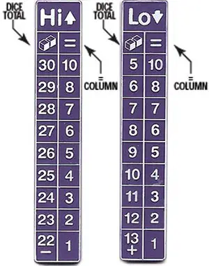 Once racked, the arrows on the Hi/Lo die tell you which side of the Score Card you use to calculate your score, regardless of whether you intended to try for hi or lo values.
