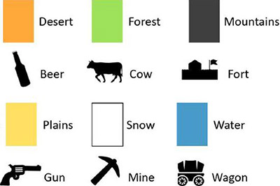 Example: Your final town has been built. The following territory groups would score: Desert 1, Forest 4, Mountains 1, Plains 2, Snow 4, Water 3 for a total of 15 Prosperity Points. Add any Bonus scoring to get your final score.