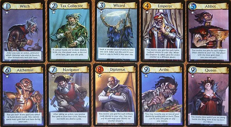 You receive one gold for each noble (yellow) district in your city. When the Emperor is called, you immediately take the Crown from the player who has it and give it to a different player (but not yourself). The player who receives the Crown chooses to give you either one gold or one district card from his hand. If the player has neither, he does not have to give you anything. If the Emperor is murdered, the Crown stays where it is. (Note that, like the King, the Emperor may not be in the faceup discarded character cards).