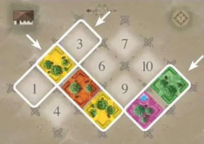 Then refill the plantation market by drawing tiles from the cloth bag and placing them on the free spaces in the market in the order of the numbers on those spaces until all 12 spots are filled.