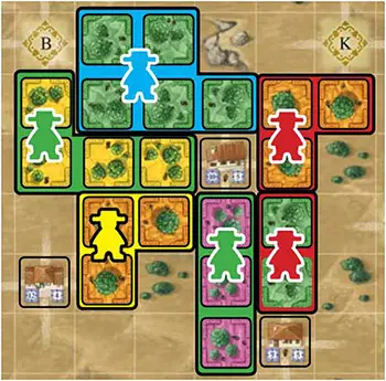 All Fincas which have not been encircled are now scored. This time, however, only the player with the most plantations in regions adjacent (also diagonally) to the Finca receives points, and he receives the smaller number (what the 2nd place player would receive during the game).