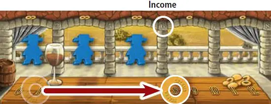 Move your marker on the money track forward the appropriate number of spaces to record your income. The maximum amount of money you can have is 12 coins. If you receive income that would exceed this limit, keep the marker on "12" and the rest of the income is forfeited.
