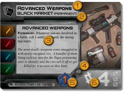 6 - Level Restriction: These colors show which areas of the board this development can be placed on. A red level restriction means the development can be placed on red spaces. A red and blue level restriction means it can be placed on red and/or blue spaces, etc.