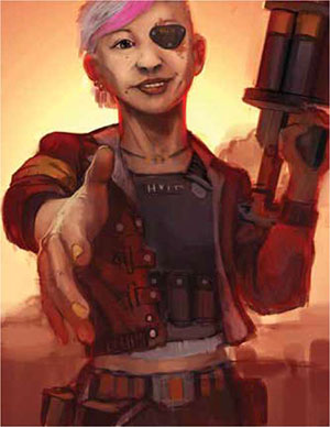 The boy stares in shock as a woman steps out of the shadows, the weight of her grenade launcher apparent in the exaggerated movements of her slender body. She is a violent shock of color, with the yellow bolt of Ret's gang on her jacket and the fuzz of her shaved head dyed white. She kneels down by him, and he looks into her one good eye. You're scared, she says. It isn't a question, but he nods yes anyway.