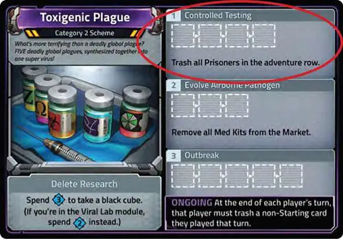 You trash all Prisoners in the adventure row. (They are not immediately replaced). Then you place the second black cube on the first space of Phase 2 of the Scheme.