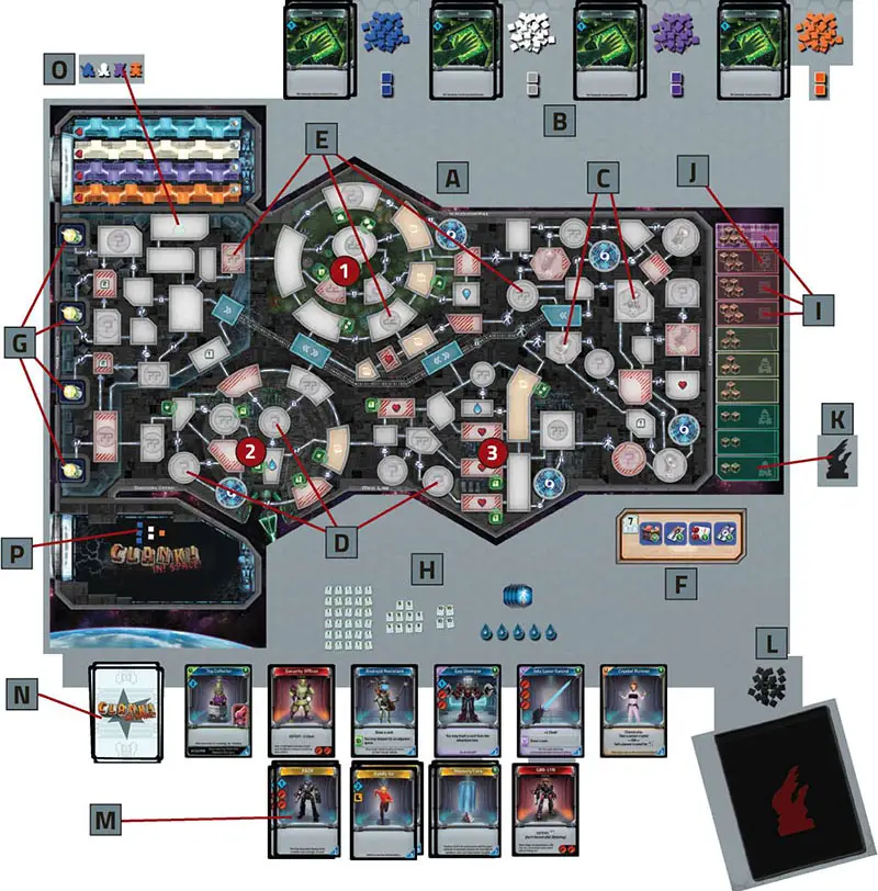 AAssemble the spaceship board in the pattern shown. It is divided into modules, three of which are used in every game: Cargo Bay, Command, and Corridor. The other three identically shaped pieces can be placed in any of three possible positions, with either side face up.For your first game, it is recommended to place those three pieces as shown: