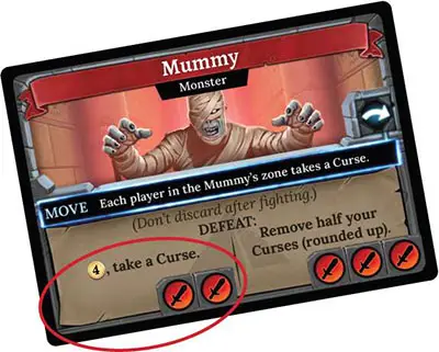 Like the Goblin, the Mummy is a monster that isn't discarded when defeated. Each side of The Mummy's Curse board is divided into four zones: three in the Depths and one above them. You can fight and defeat the Mummy only when its marker is in the same zone as your current room.