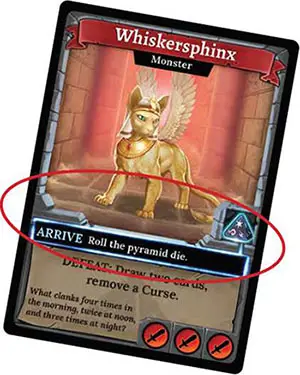 Some cards have Arrive text which directs you to roll the pyramid die. This moves the Mummy in the same way.