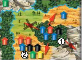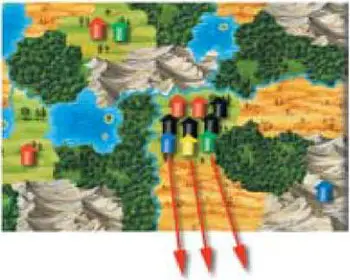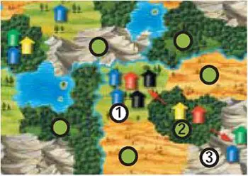 There is an important restriction: a player cannot move huts from a territory that already contains 7 or more huts. A player may move huts to such a territory. In the rare case of two neighboring territories containing 7 or more huts each, a player may move the smaller group to the larger one.