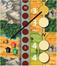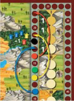 The players move their scoring discs forward on the scoring track to score the village chips they collected for founding villages (1 point per chip).