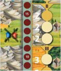 The game is played over 5 epochs. In each of the first four epochs, one type of territory is particularly favorable for the formation of villages while another type is extremely unfavorable, so that any village completed there in that epoch is inevitably doomed. On the epoch chart, the left side indicates the favorable type of territory, the right side the unfavorable one.